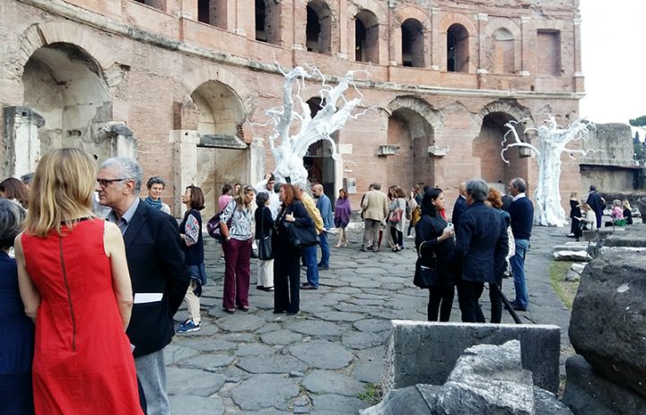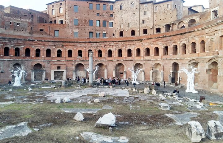 All’interno del porticato dei Mercati di Traiano, Ugo Rondinone ha presentato per la prima volta in Italia “Notti d’Argento”, un gruppo di 5 calchi di ulivi millenari, prodotti in alluminio e rivestito in smalto bianco. L’artista, che vuole rendere omaggio alla terra originaria della sua famiglia, immigrata in Svizzera da Matera, ha concepito l’idea di riportare il monumento a un’era antichissima, in una sorta di foresta pietrificata simile a quella della preistoria. La flora, contemporaneamente fossili e oggetti contemporanei, sono carichi di una dimensione drammatica ed espressiva, quasi epica, sospesa tra naturale e artificiale.